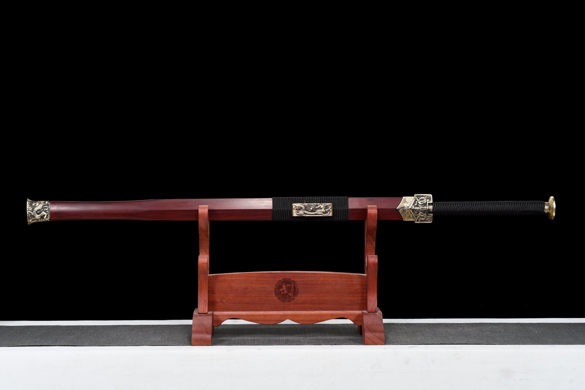 The sword body is forged from a hundred refined patterned steel, with a hard texture, finely ground on all sides, and retains the calcined hammer pattern. Beautiful and domineering! The high-quality sour branch wood is made of sword scabbards, and the color is glossy! Pure copper fine carving of the four beasts and Han sword equipment