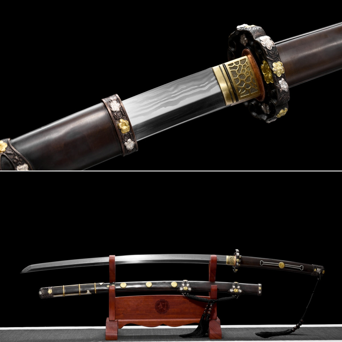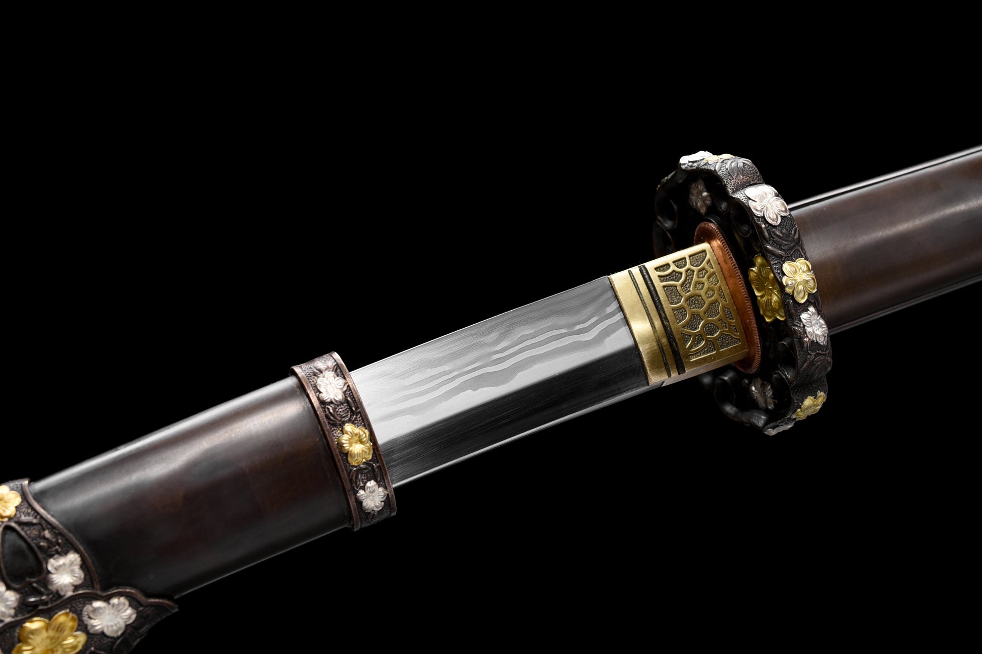 The blades are Damascus steel Full Tang Blade with Real Hamon, saya (scabbard) brass, and the fittings are gold-plated and silver-plated, and the brass gilding silvering theme tsuba, brass handle