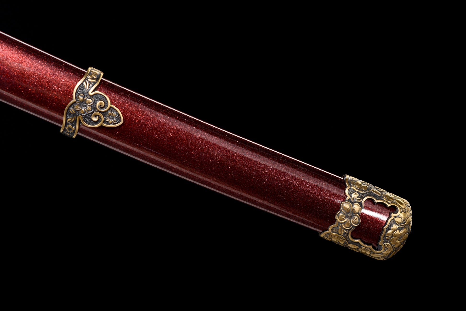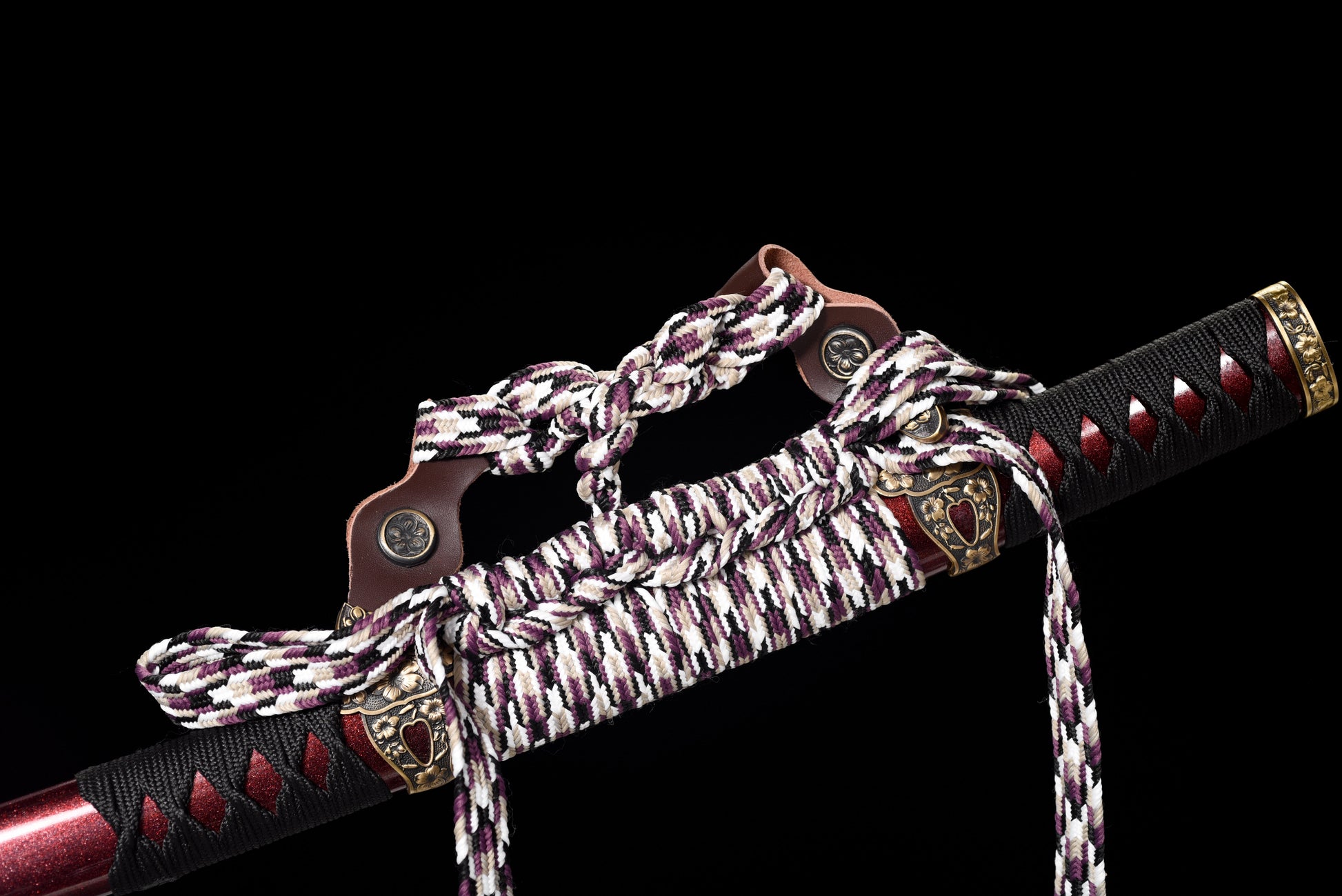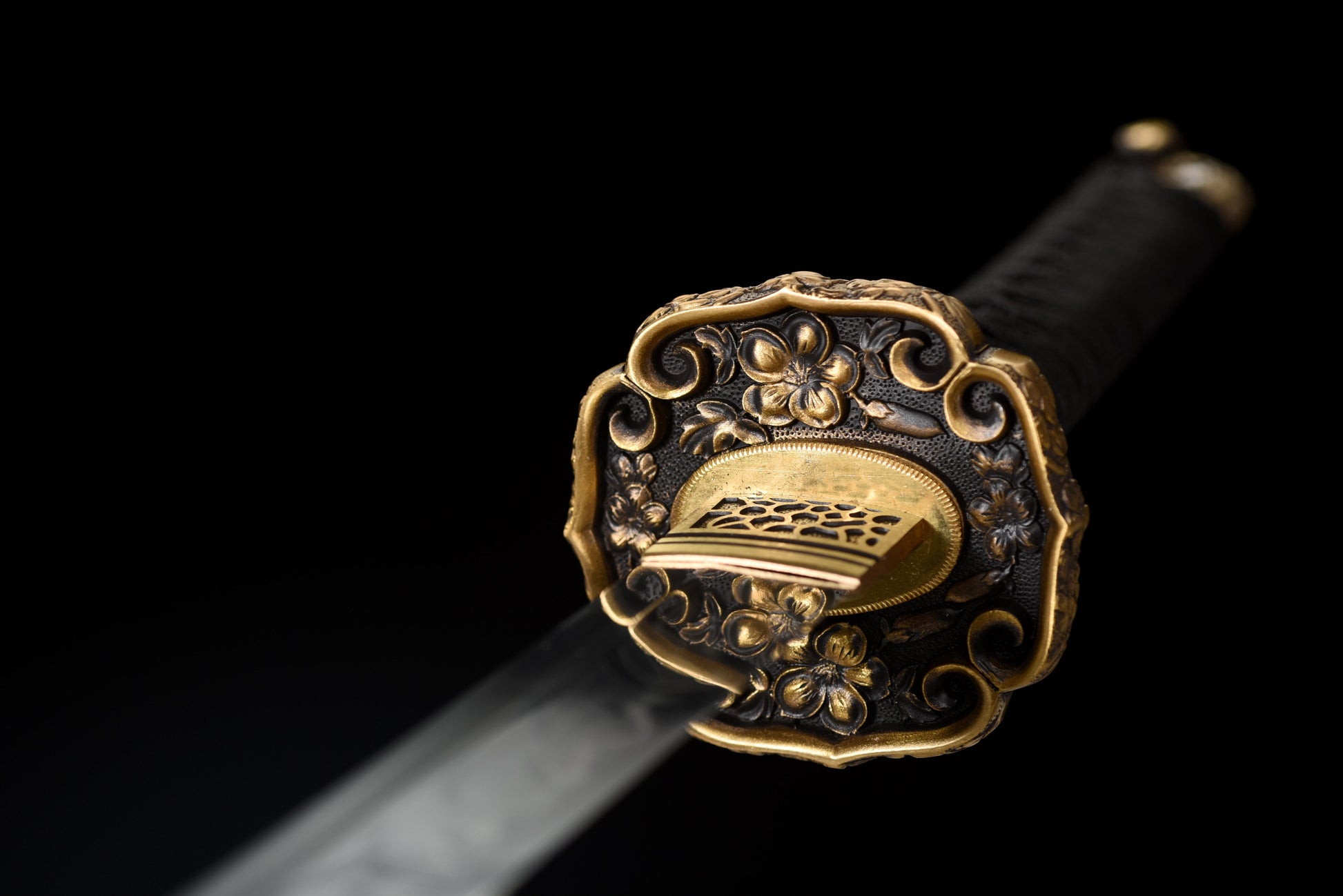 The Blade is T10 steel Full Tang Blade with Real Hamon, saya (scabbard) is made of solid wood, brass carved cherry blossom theme tsuba, white ray-skin wrap, black cord handle
