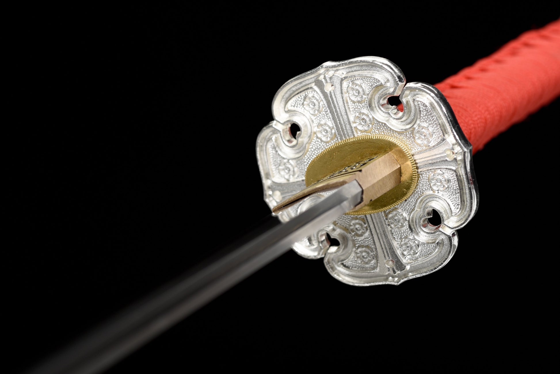 Blade is t10 steel Real Hamon Full Tang Blade mirror grinding process, saya (scabbard) solid wood material, silver theme tsuba, black real ray-skin wrap, red cord handle