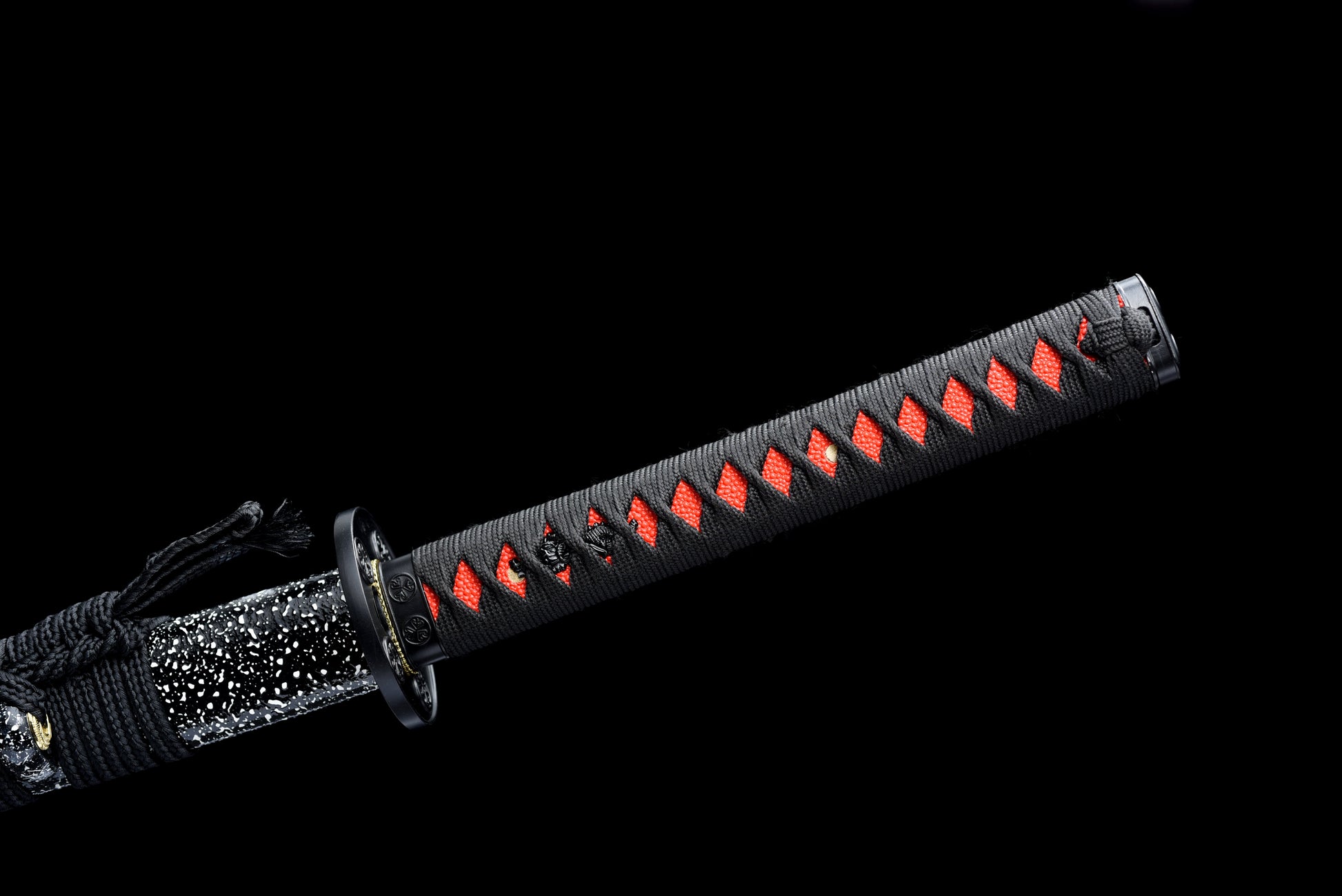 The blades are made of 1095 high-carbon steel, red blade, saya (scabbard) for black paint, black theme tsuba, red ray-skin wrap, black cord handle