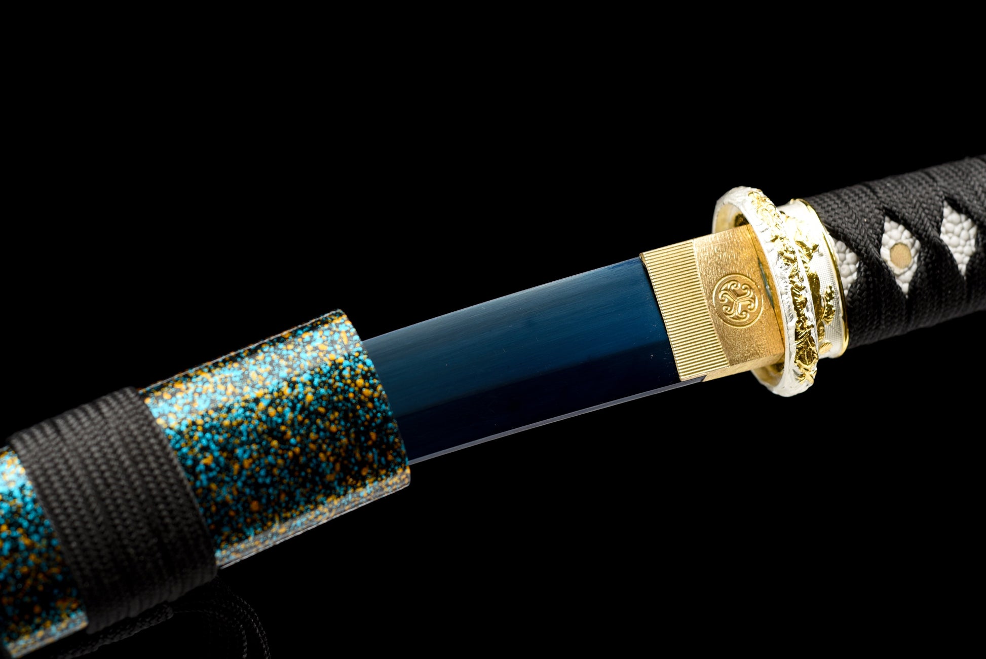 High manganese steel blade, Blue scabbard, Black cord handle with white ray-skin wrap.
