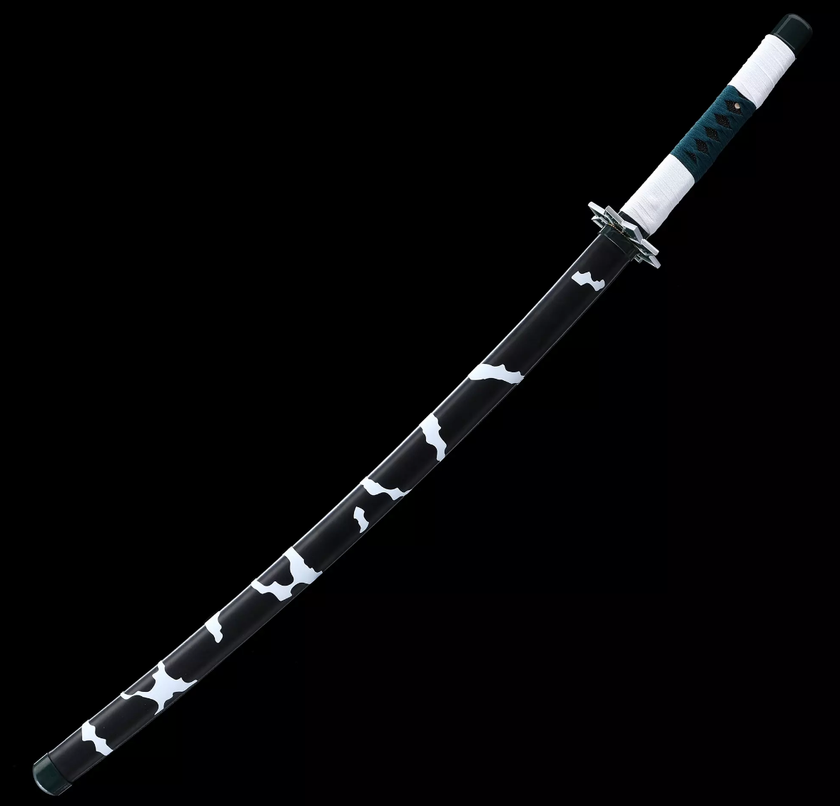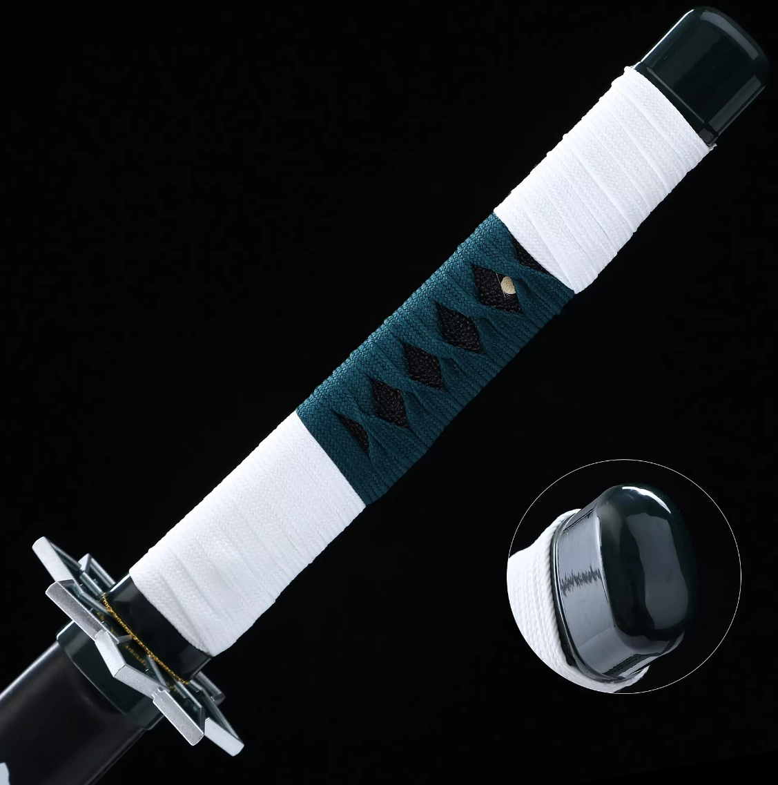- The anime sword is made of 1045 carbon steel, it features a green tsuba, black scabbard, white cord handle with black ray-skin wrap and alloy fittings.